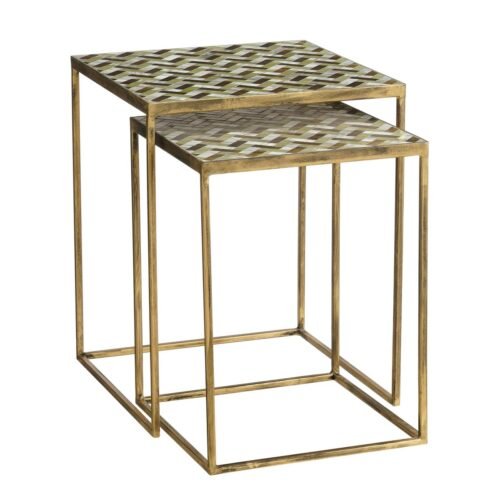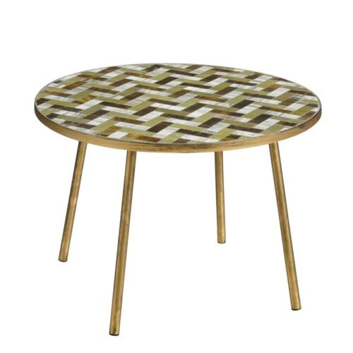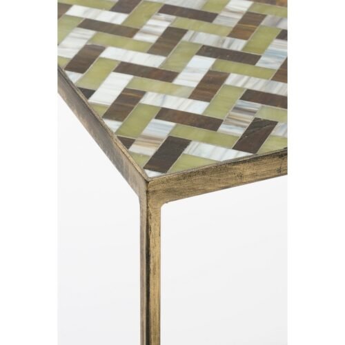 Van ontspannen koffiemomenten tot gezellige borrels: met deze Alanza salontafel van Mica Decorations creëer je gegarandeerd een gezellige setting in je achtertuin, op je balkon of op het terras. De tafel voor buiten is gemaakt van stevig, goudkleurig metaal met een mooi design van groene tegels op het blad. Door het materiaal is hij waterbestendig waardoor je hem gerust buiten kunt laten staan, ongeacht het weer. Combineer hem met de andere artikelen uit de Alanza-serie en maak je setting met Parijse uitstraling compleet! Ook leuk: plaats hem tegen de wand met wat leuke plantjes erop! De tafel heeft een lengte van 99 cm, een breedte van 41 cm en een hoogte van 46 cm.