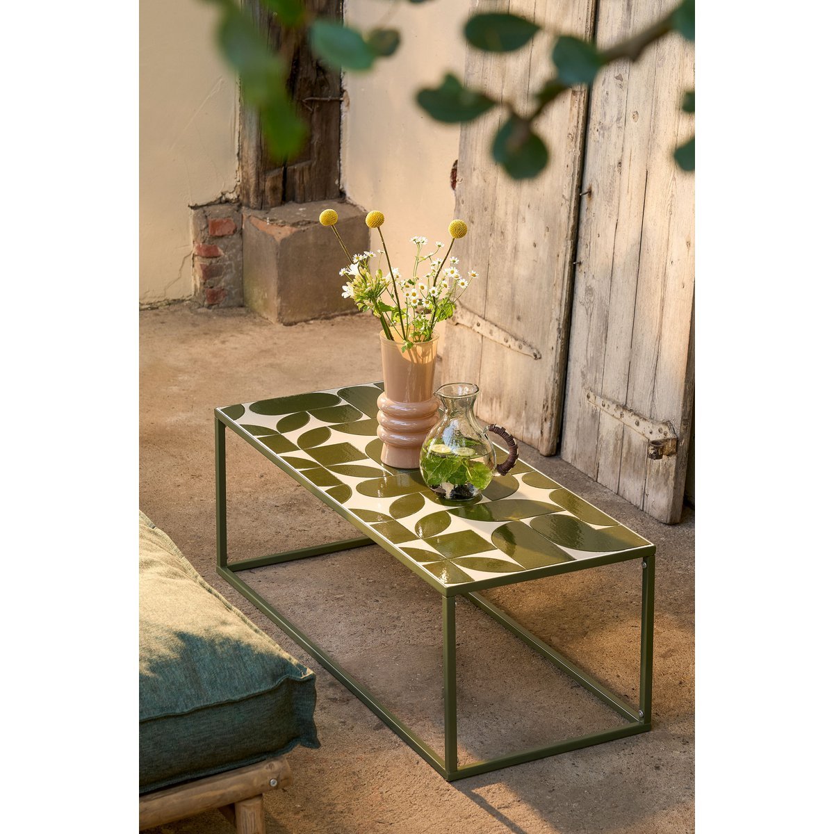 Met deze Bologna salontafel van Mica Decorations breng je een beetje Italië naar achtertuin, terras of balkon. De tafel voor buiten is gemaakt van stevig, groen metaal met een mooi design van groene tegels op het blad. Door het materiaal is hij waterbestendig waardoor je hem gerust buiten kunt laten staan, ongeacht het weer. Combineer hem met de andere artikelen uit de Bologna-serie en maak je setting compleet! Ook leuk: plaats hem tegen de wand met wat leuke plantjes erop! De tafel heeft een lengte van 99 cm, een breedte van 41 cm en een hoogte van 46 cm.