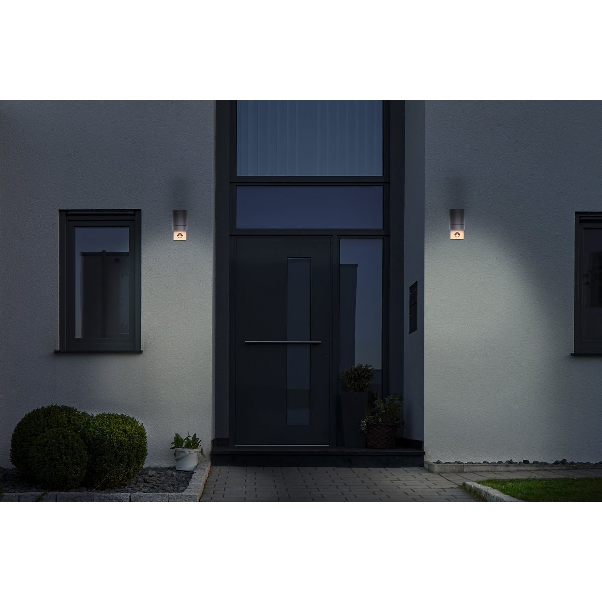 Buiten Wall Lamp “Romb” met bewegingsdetector, antraciet -gekleurd aluminium, timer, veranderbare lamp, 7 x 12,5 x 16,4 cm is een veelzijdige keuze die moeiteloos combineert met uiteenlopende stijlen.