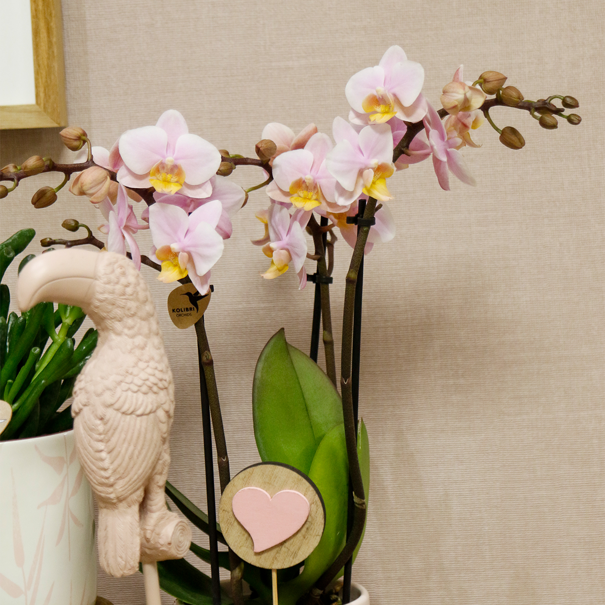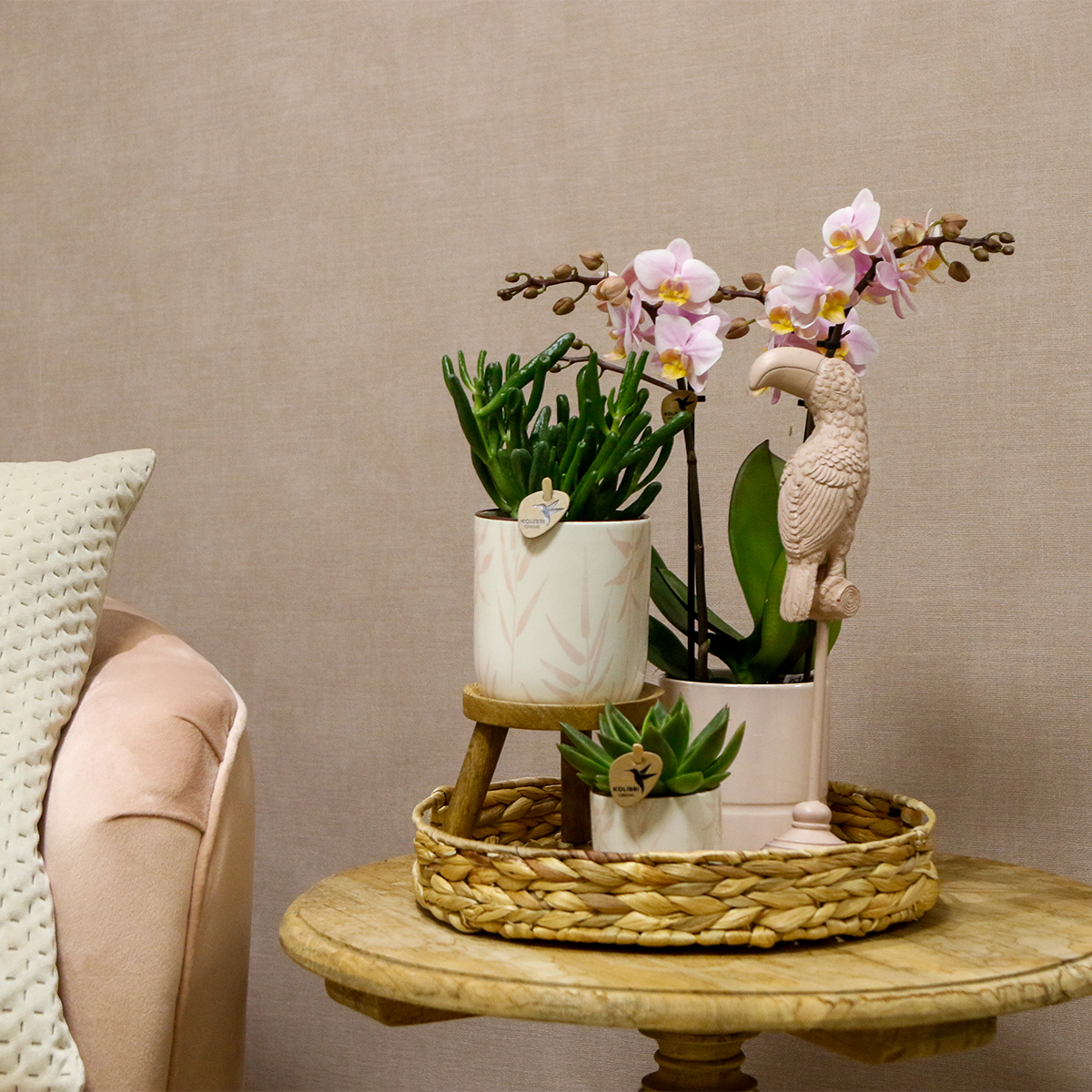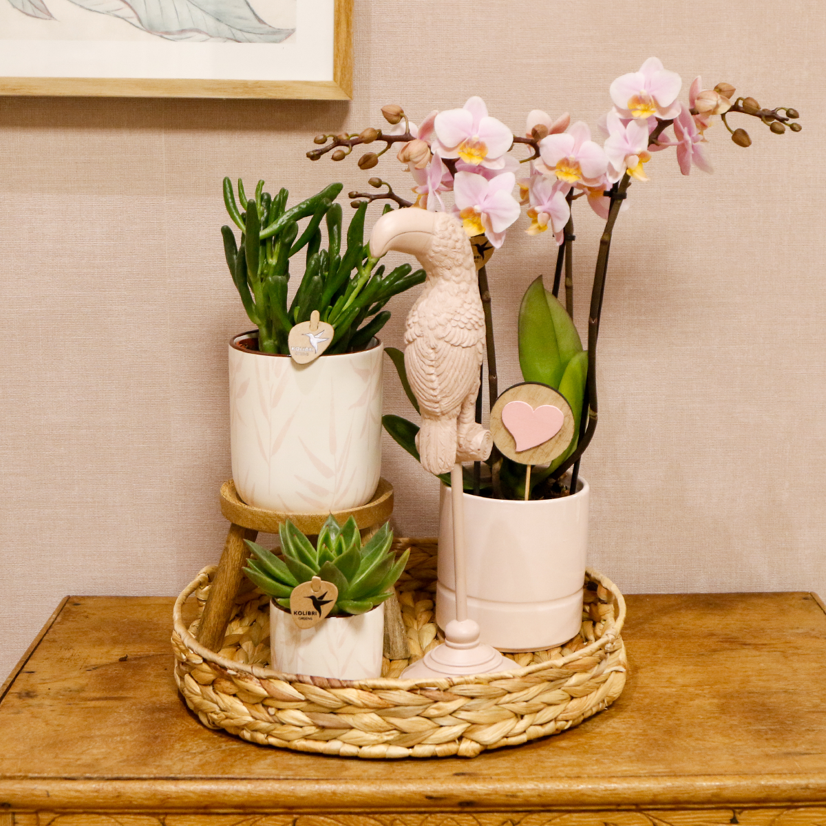 Kolibri Company | Gift set Love pink| Plantenset met roze Phalaenopsis Orchidee en Succulenten incl. keramieken sierpotten is een veelzijdige keuze die moeiteloos combineert met uiteenlopende stijlen.