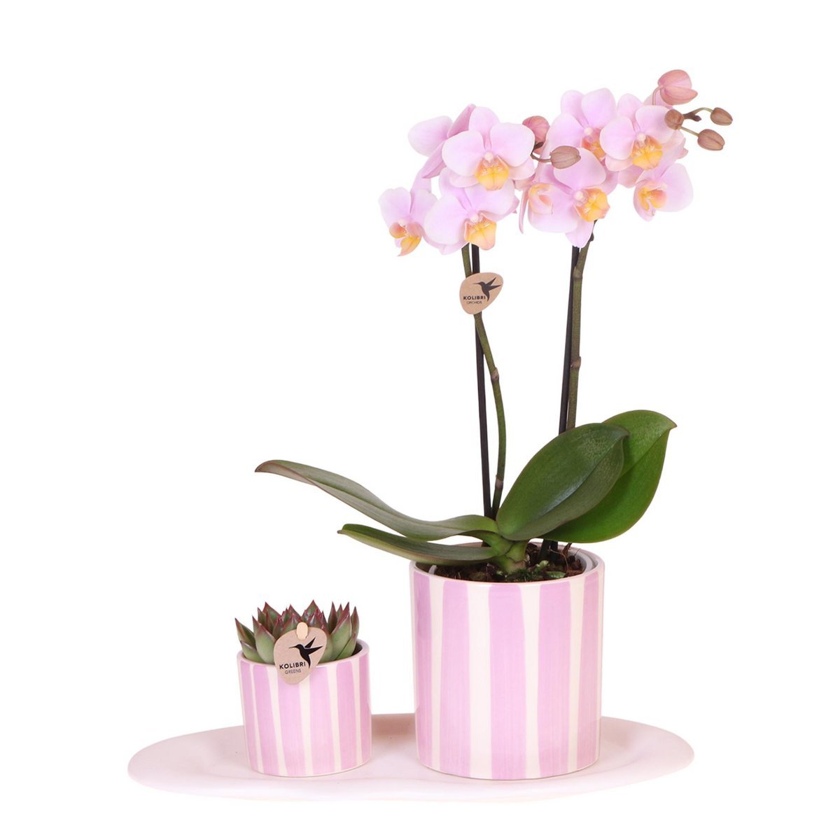 Kolibri Orchids | Set van roze orchidee Andorra en succulent in Painted Stripe sierpot op cloud plate – potmaat Ø9cm & Ø6cm | bloeiende kamerplant – vers van de kweker brengt stijl en functionaliteit samen. Met hoogwaardige materialen en een doordacht ontwerp is dit een aanwinst voor elk interieur.